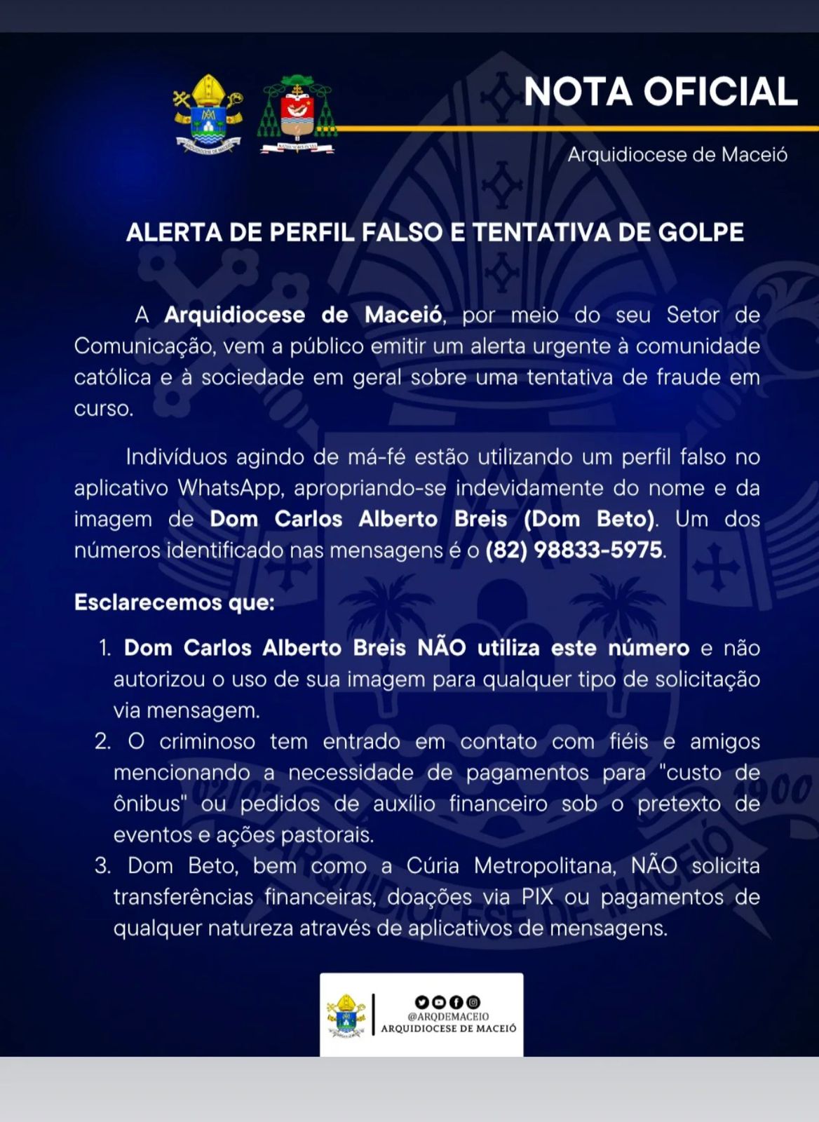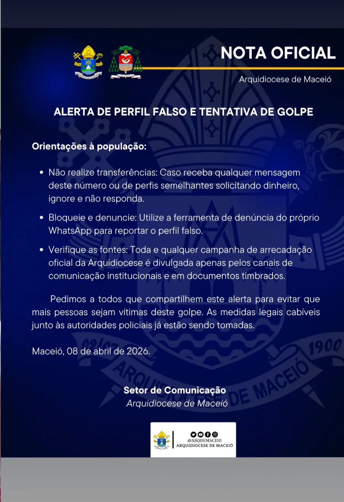 “A Arquidiocese de Maceió, por meio do Setor de Comunicação, vem a público emitir um alerta urgente à comunidade católica e à sociedade em geral sobre uma tentativa de fraude em curso.