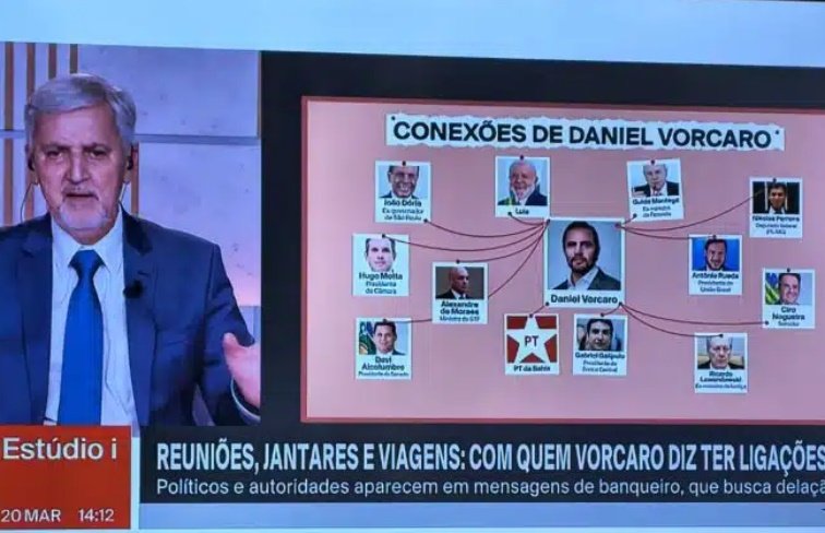 canal a cabo de notícias GloboNews levou ao ar na tarde desta sexta-feira (20) uma ilustração “explicativa” sobre o escândalo do Banco Master que deixou até o mais desavisado dos espectadores incrédulo. O PowerPoint usado pela emissora, que relembrou o caso igualmente inacreditável ocorrido na Lava Jato pelas mãos do procurador Deltan Dallagnol, apresentava como figura central o banqueiro preso Daniel Vorcaro e, a partir dele, um barbante que “o liga a figuras políticas”.