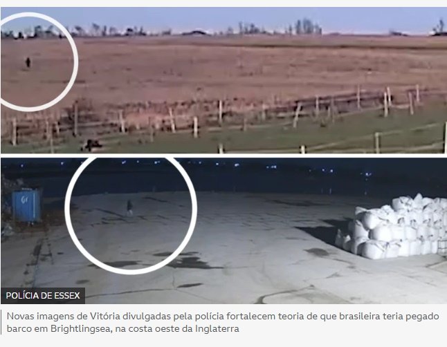 Segundo a polícia do condado de Essex, que lidera as buscas, foram obtidas duas novas filmagens que parecem mostrar Vitória. Uma delas, da tarde do dia 3 de março, supostamente mostra a brasileira atravessando uma área de fazenda a cerca de um quilômetro do estaleiro de Brightlingsea.