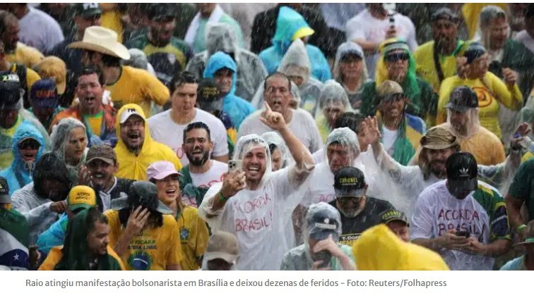 De acordo com o Corpo de Bombeiros do Distrito Federal, a descarga elétrica caiu em meio à concentração de apoiadores nas proximidades da Praça do Cruzeiro, ponto final da manifestação. Houve pânico e correria. Imagens que circulam nas redes sociais mostram o momento exato em que o raio atinge a área onde os manifestantes estavam reunidos, com várias pessoas caindo ao chão logo após a descarga elétrica.
