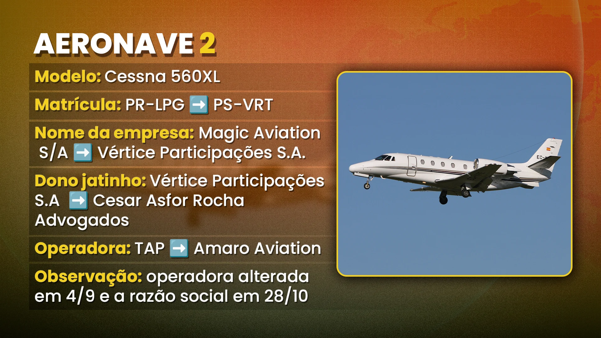 A aeronave também teve sua matrícula alterada de PR-LPG para PS-VRT. Pouco mais de quatro meses depois, em 9 de fevereiro de 2026, o mesmo jatinho foi transferido para o escritório de advocacia ligado à família Asfor Rocha.