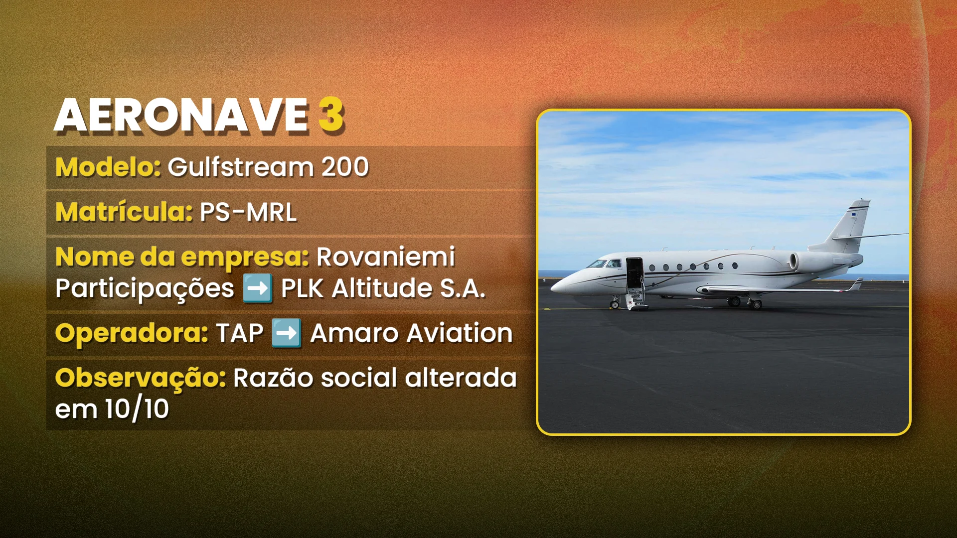 Movimento semelhante foi identificado em outro avião da frota atribuída a Rueda. O jatinho Gulfstream G200, de matrícula PS-RML, também registrado em nome de uma empresa ligada à Bariloche Participações e dirigida por Bruno Ferreira Vicente Queiroz — a Rovaniemi Participações — passou por alteração da razão social no mesmo período.