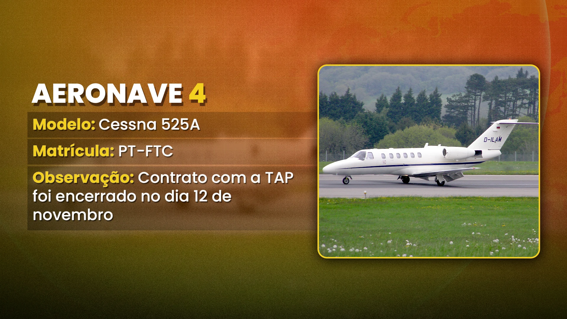 A quarta aeronave citada pelo piloto, o Cessna 525A, está em nome da Serveg Serviços, que em novembro do ano passado rompeu o contrato com a TAP.