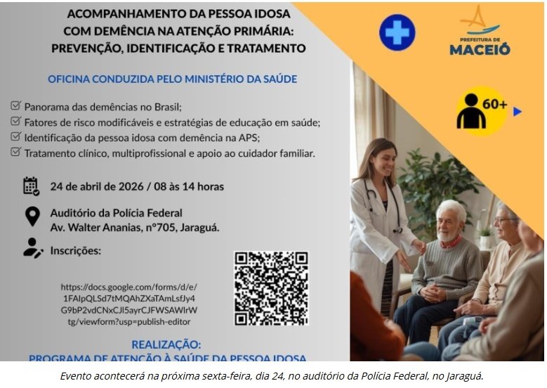 O Programa de Atenção à Saúde da Pessoa Idosa, da Secretaria Municipal de Saúde de Maceió, abre inscrições para uma oficina estratégica voltada ao acompanhamento da pessoa idosa com demência na Atenção Primária à Saúde. O evento acontecerá no próximo dia 24 de abril, no auditório da Polícia Federal (Jaraguá), das 8h às 14h.